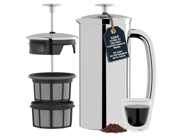 This French press is excellent for those who want both quantity and quality. Its large capacity makes it perfect for serving groups, while the dual filter ensures a clean brew.