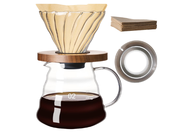 The gegewawa Pour Over Coffee Maker Set is designed for simplicity and clarity. With a 20oz borosilicate glass carafe and cone dripper, it uses paper filters to produce bright, clean coffee. Its compact size makes it perfect for individuals or small households.